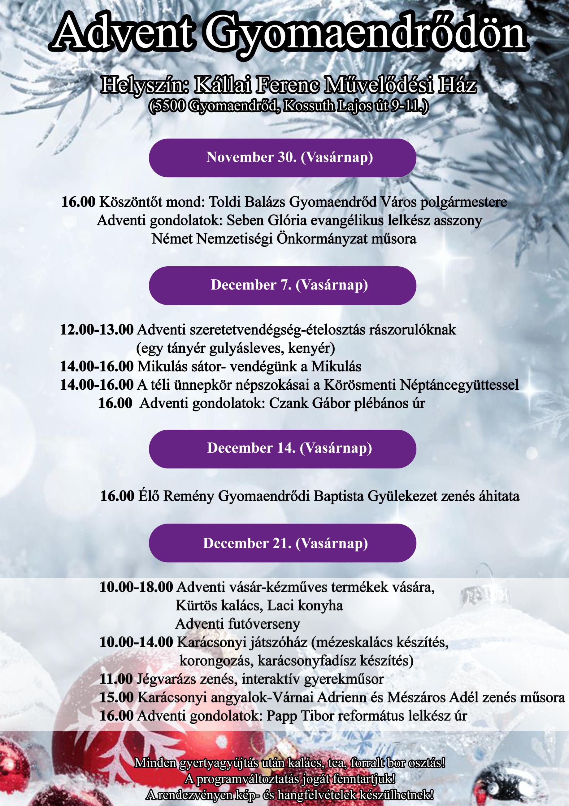12:00 - 13:00 - Adventi szeretetvendégség-ételosztás rászorulóknak (egy tányér gulyásleves, kenyér)