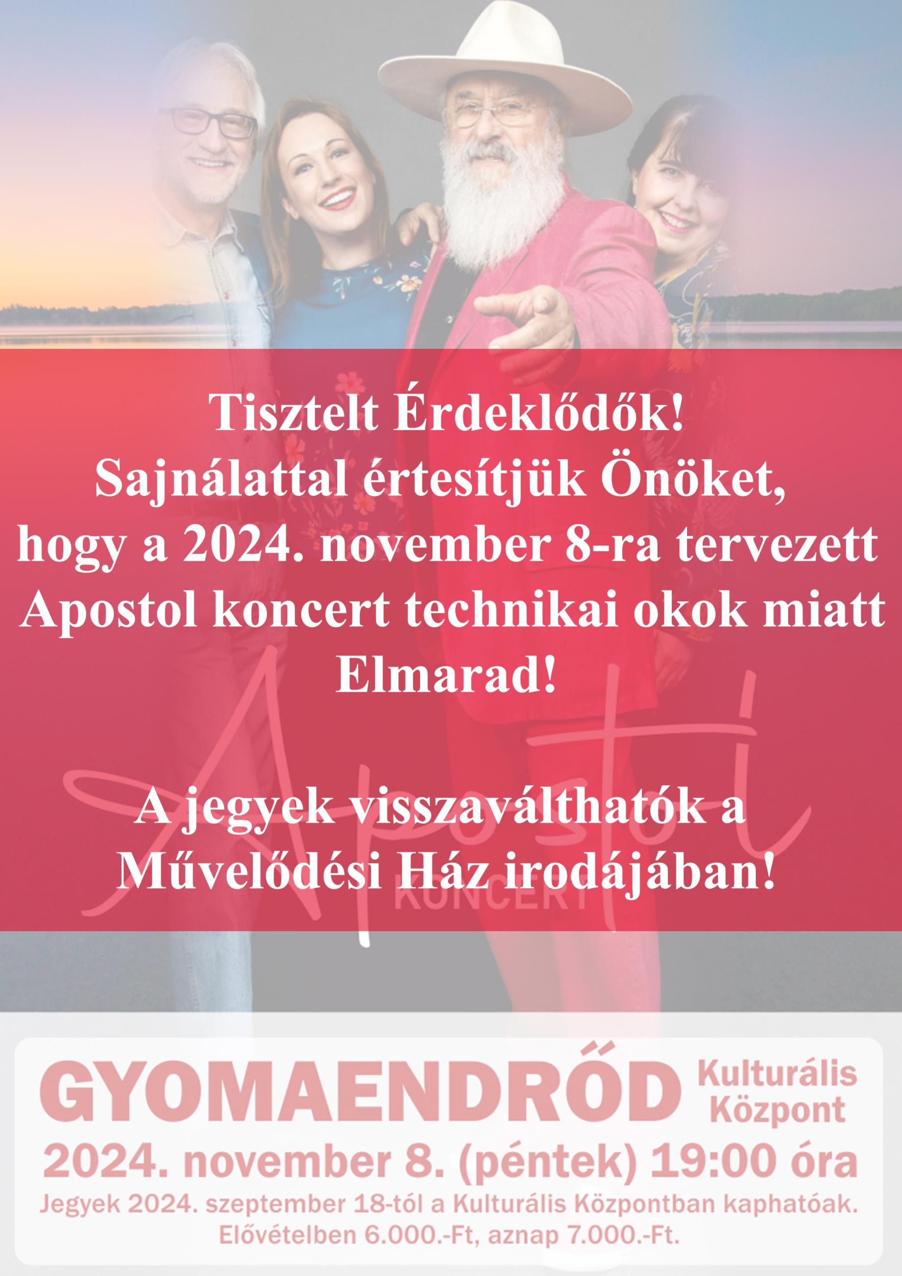 Sajnálattal értesítjük Önöket, hogy a 2024. november 8-ra tervezett Apostol koncert technikai okok miatt Elmarad!