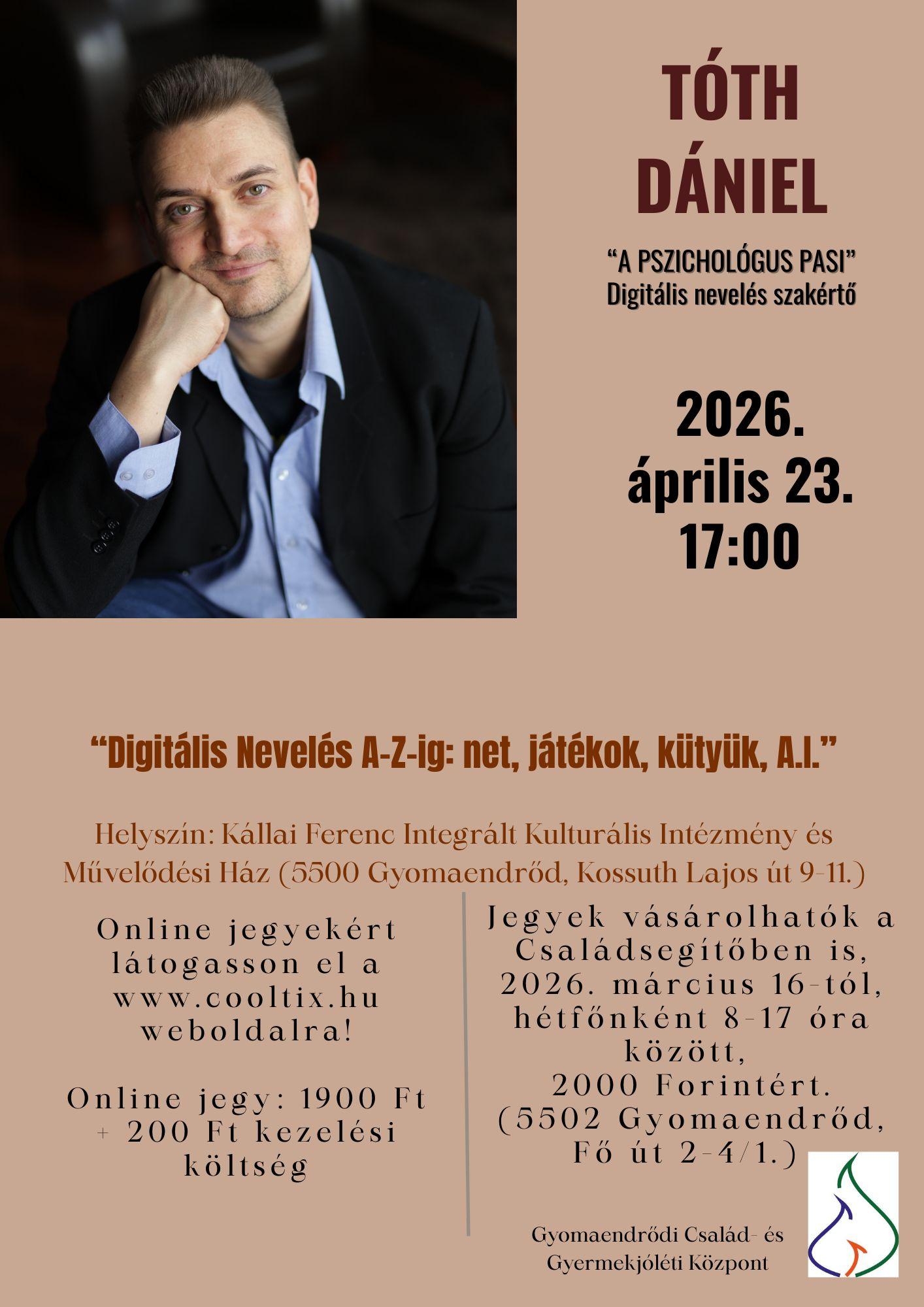 Tóth Dániel, közismertebb nevén a Pszichológus Pasi beszél a Digitális Nevelésről szülőknek, pedagógusoknak és minden érdeklődőnek! Tóth Dániel közismertebb nevén a Pszichológus Pasi, a Digitális Nevelés hazai úttörőjeként az internet, videojátékok és okos kütyük világára, ezek ránk gyakorolt hatásaira szakosodott pszichológus, egyben gamer-influencer és 4 gyermekes édesapa. Ezt kutatta, ezzel foglalkozik több mint 20 éve, ezt tanítja ma mindenfelé óvodától egyetemig, gyerekektől felnőtt orvos, pedagógus, pszichológus és gyermekvédelmi szakemberekig.