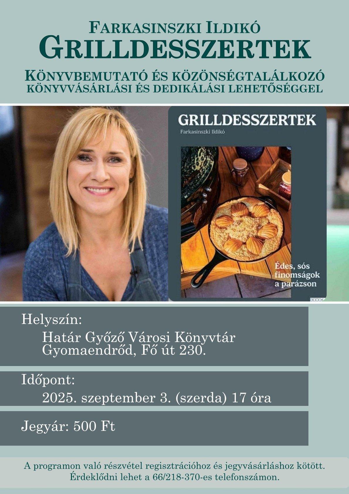 Hogy hogyan jut eszébe valakinek desszerteket készíteni grillen, Ildikó esetében nem is kérdés, "adja magát"! Minden érdeklődőt várnak egy ínycsiklandó beszélgetésre, könyvbemutató közönségtalálkozóra. Könyv vásárlási és dedikálási lehetőség a helyszínen.