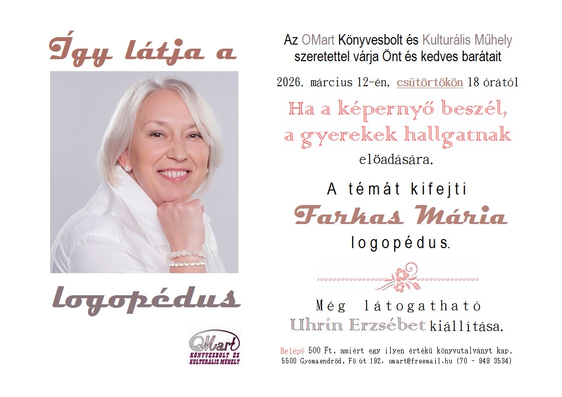 Az OMart Könyvesbolt és Kulturális Műhely szeretettel várja Önt és kedves barátait 2026. március 12-én, csütörtökön 18 órától "Ha a képernyő beszél, a gyerekek hallgatnak" előadásra.