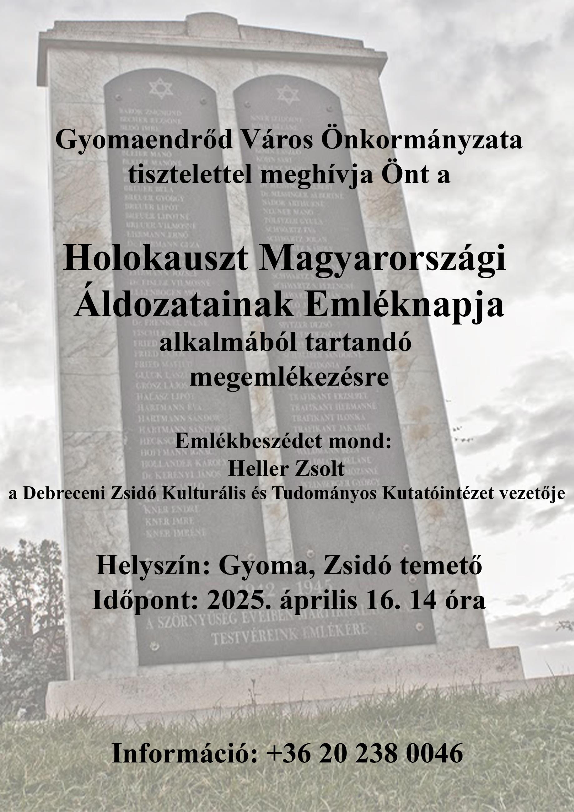 Gyomaendrőd Város Önkormányzata tisztelettel meghívja Önt a Holokauszt Magyarországi Áldozatainak Emléknapja alkalmából tartandó megemlékezésre.