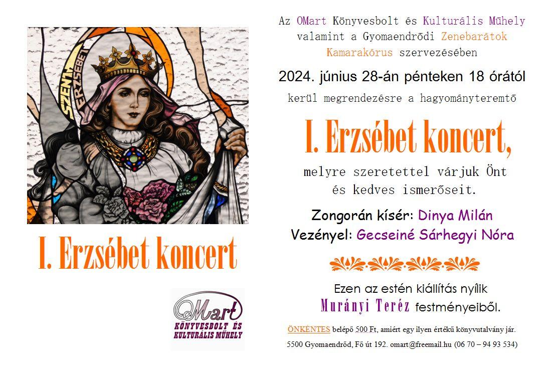 Az OMart Könyvesbolt és Kulturális Műhely valamint a Gyomaendrődi Zenebarátok Kamarakórus szervezésében 2024. június 28-án, pénteken 18 órától. kerül megrendezésre a hagyományteremtő I. Erzsébet koncert melyre szeretettel várjuk Önt és kedves ismerőseit.