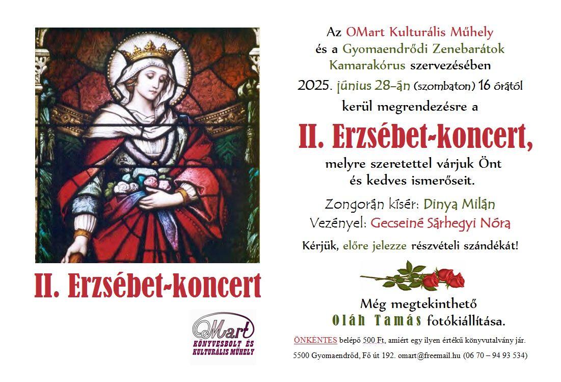 Az OMart Könyvesbolt és Kulturális Műhely szeretettel várja Önt és kedves barátait 2025. június 28-án szombaton, 16 órától kerül megrendezésre a II. Erzsébet koncert melyre szeretettel várjuk Önt és kedves ismerőseit.