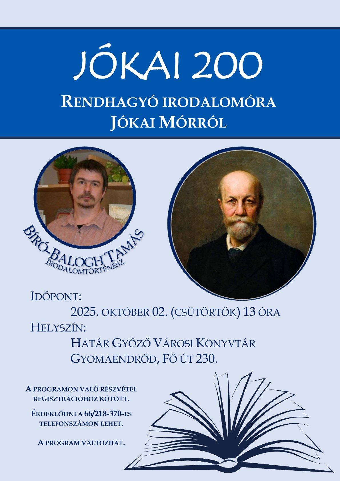 Bíró-Balogh Tamás irodalomtörténész tart rendhagyó órát Jókai Mór születésének 200. évfordulójához kapcsolódva a Magyar Írószövetség támogatásának köszönhetően. Az előadás bemutatja, milyen önreprezentációs eszközök álltak a regényíró rendelkezésére, hogyan szerepelt a korabeli sajtóban.