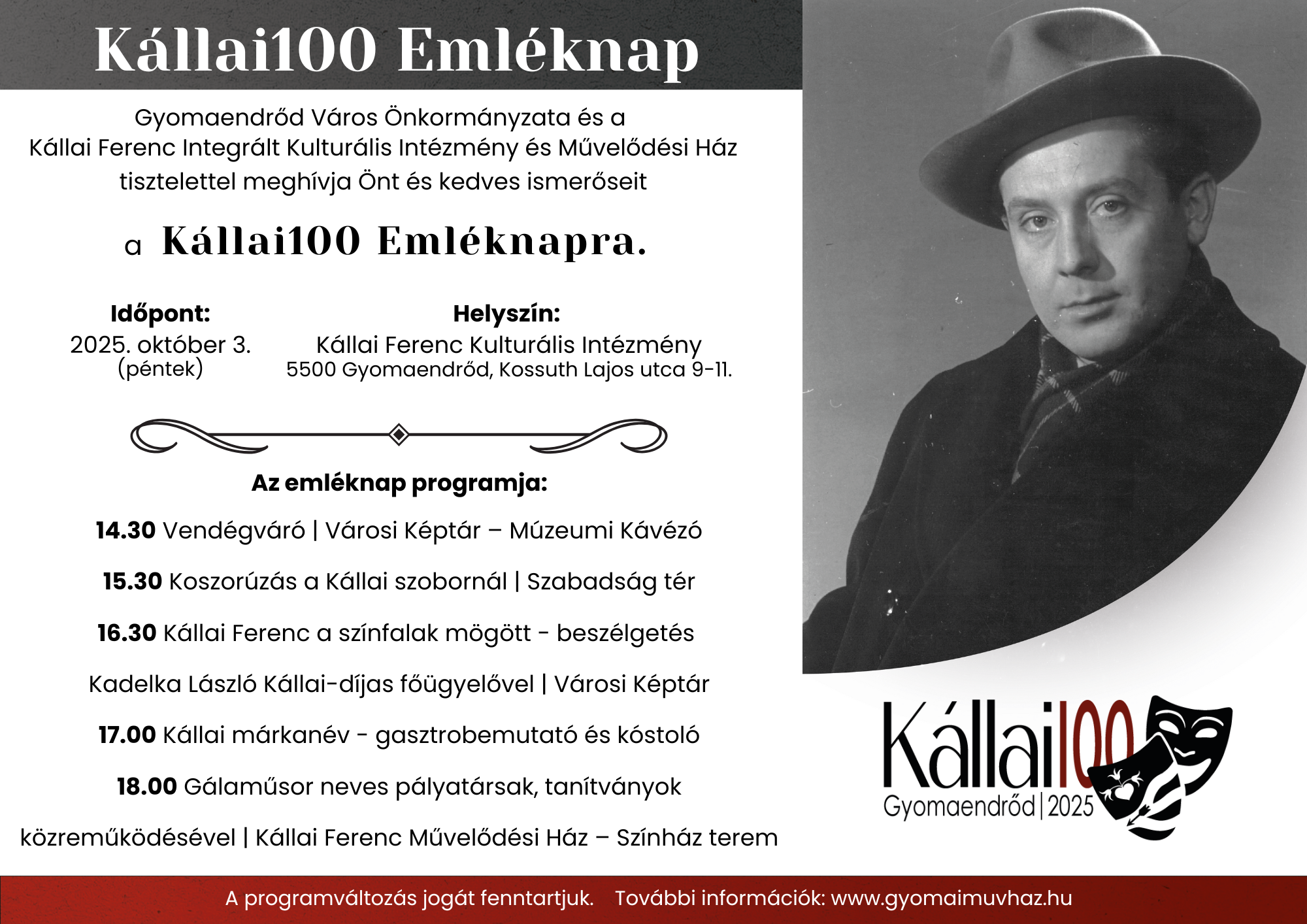 Gyomaendrőd Város Önkormányzata és a Kállai Ferenc Integrált Kulturális Intézmény és Művelődési Ház tisztelettel meghívja Önt és kedves ismerőseit a Kállai100 Emléknapra.