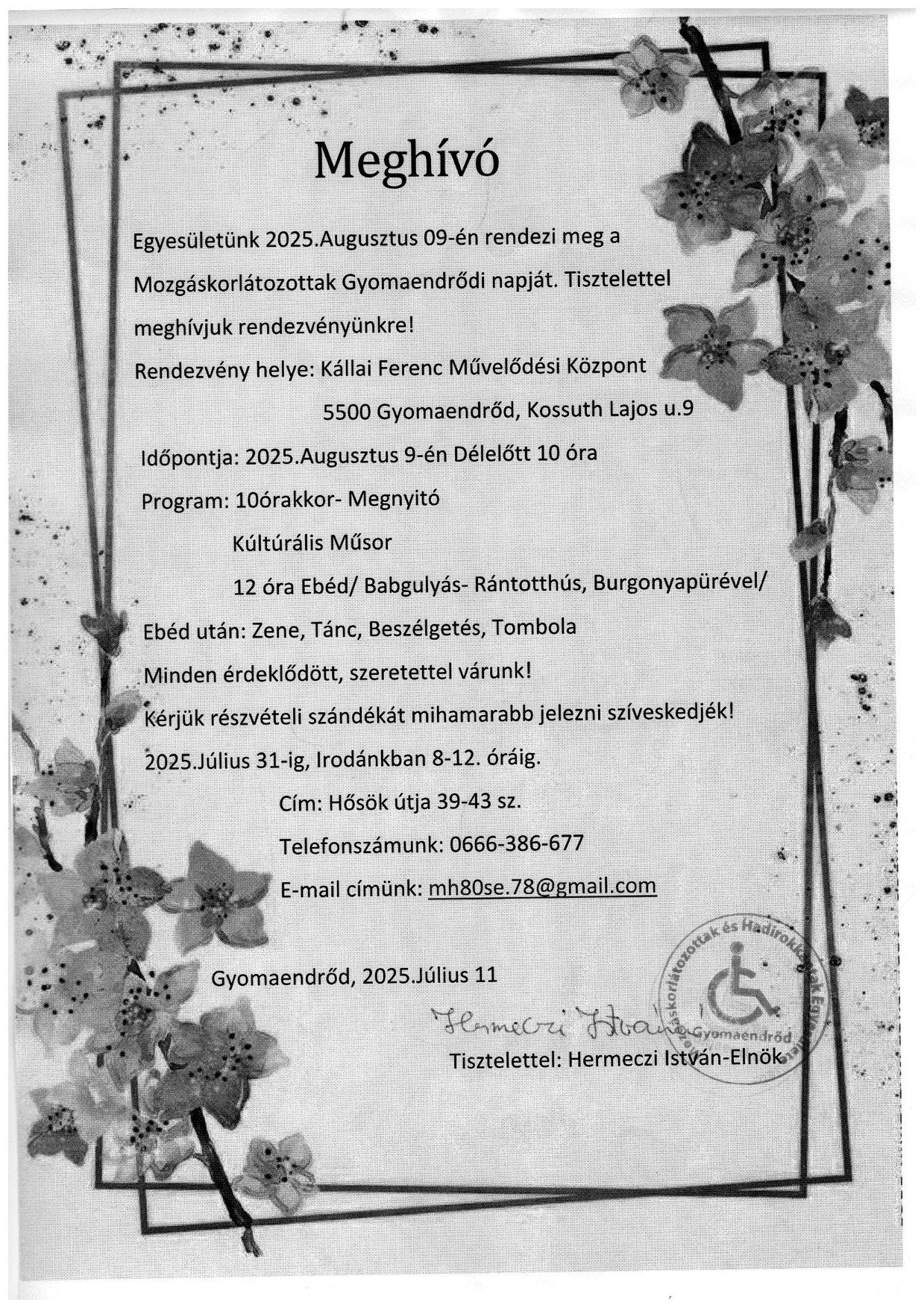 Egyesületünk 2025. augusztus 9-én rendezi meg a Mozgáskorlátozottak Gyomaendrődi napját.