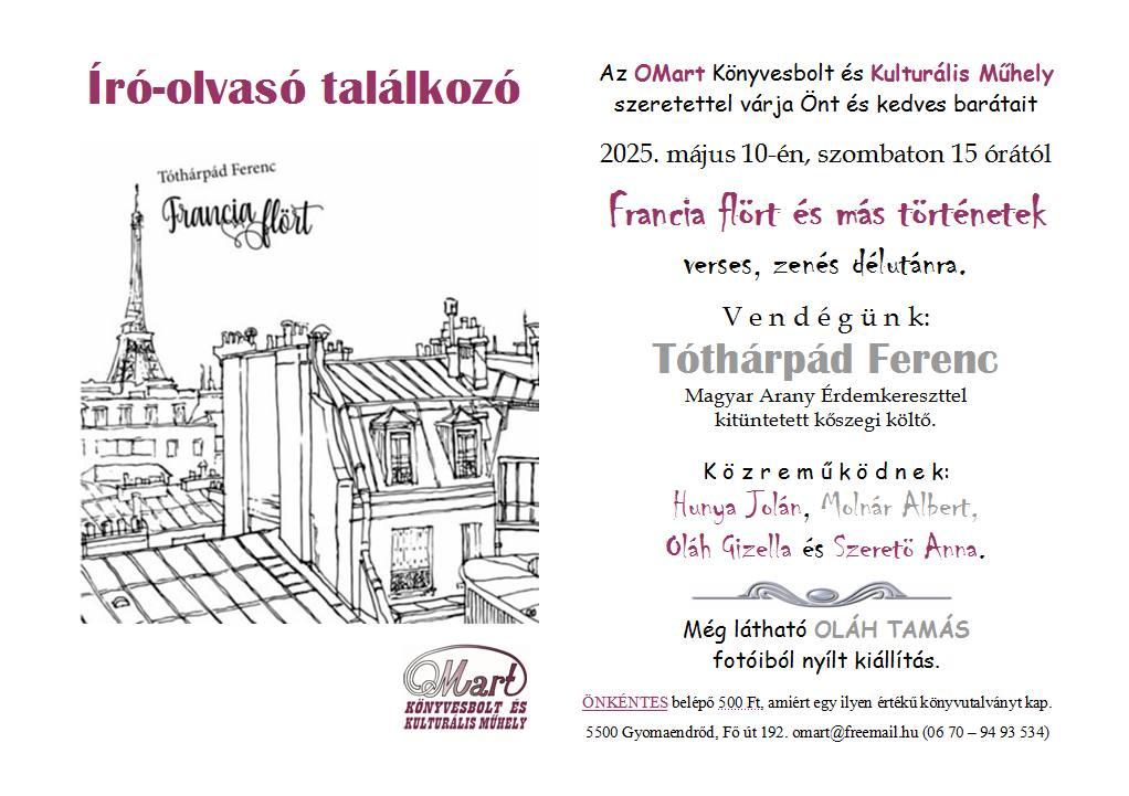 Az OMart Könyvesbolt és Kulturális Műhely szeretettel várja Önt és kedves barátait 2025. május 10-én szombaton, 15 órától "Francia flört" és más történetek verses, zenés délutánra.