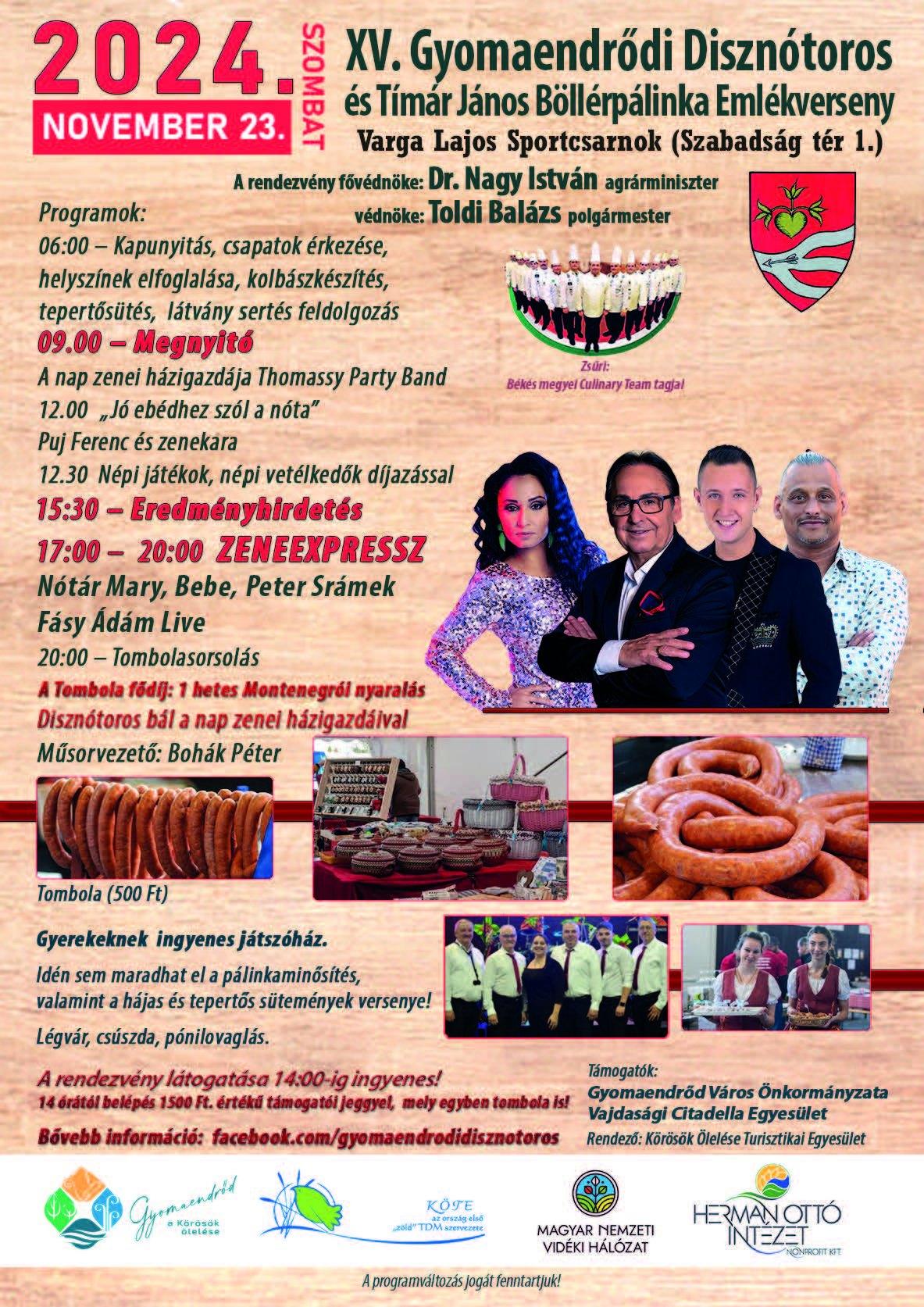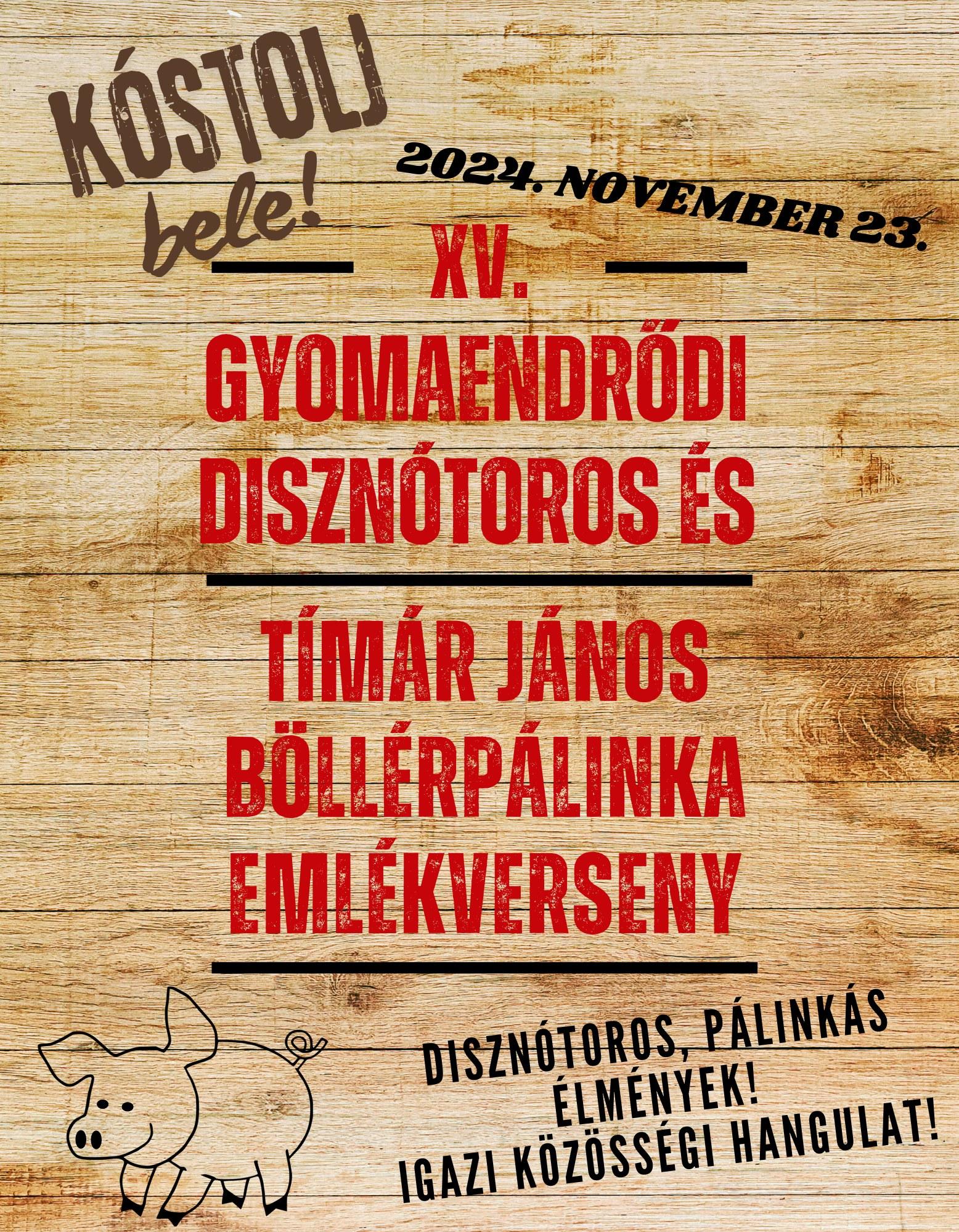 A Gyomaendrődi Disznótoros és Böllérpálinka Verseny a nagyapáinktól tanult disznótoros hagyományok, gasztronómiai élmények újraélése. A rendezvény piacán helyi készítésű kolbász, tepertő, füstölt hús kapható. A vendéglátás hagyományos disznótoros ételekkel (hagymás vér, cigánka, pecsenye) várja a gasztronómiai élményekre vágyókat.
