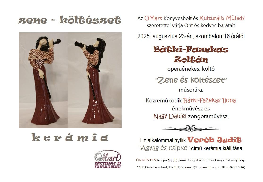 Az OMart Könyvesbolt és Kulturális Műhely szeretettel várja Önt és kedves barátait 2025. augusztus 23-án, szombaton 16 órától Bátki-Fazekas Zoltán operaénekes, költő "Zene és költészet" műsorára.