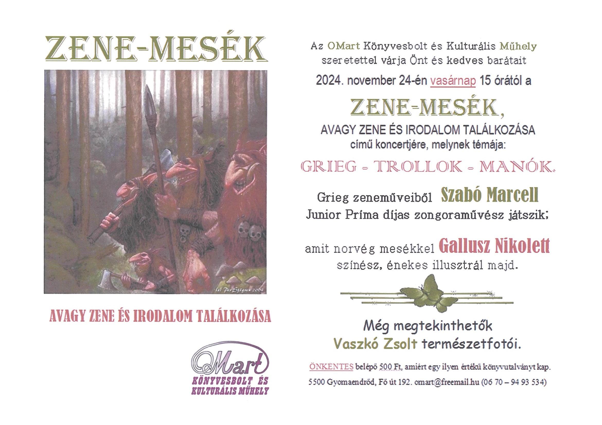 Az OMart Könyvesbolt és Kulturális Műhely szeretettel várja önt és kedves barátait 2024. november 24-én, vasárnap 15 órától, a Zene-Mesék avagy zene és irodalom találkozása című koncertjére, melynek témája: Grieg-Trollok-Manók.
